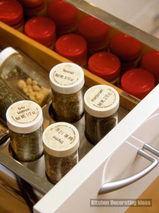 Spice storage ideas: Drawers are ideal for storing spices. They have all spices allow fingertips when necessary and hide them from sight, when this is not necessary. Not place the label on the lid, if the banks are vertically or on a lateral surface of the container, or if they are tilted.