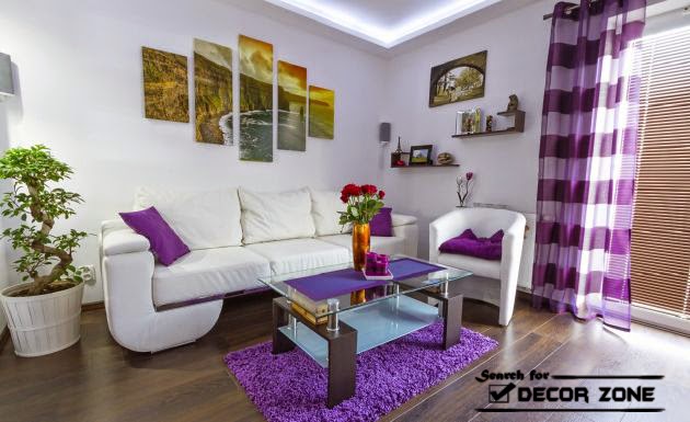 white living room design with purple curtains, carpet and cushions