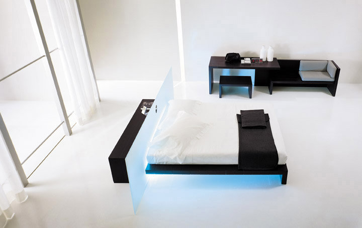 high-tech bedroom designs – bed and table with LED lighting