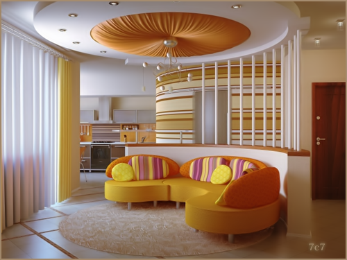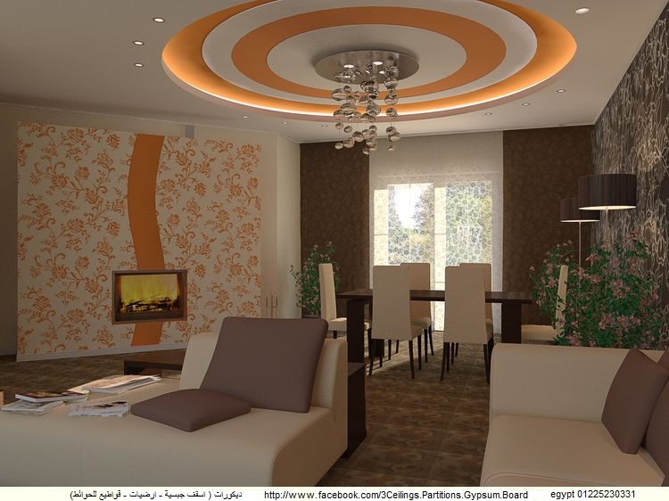 cool ceiling made of gypsum the round layer that takes the white color was made of gypsum, the most interesting element in this design is the central curtain, it takes the same color of the furniture, and it fits perfectly in the modern style of the interior