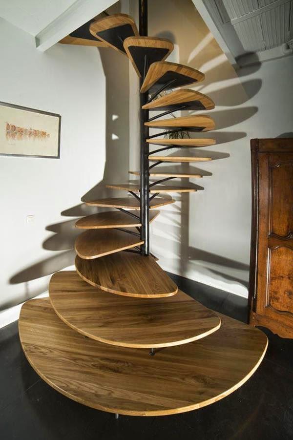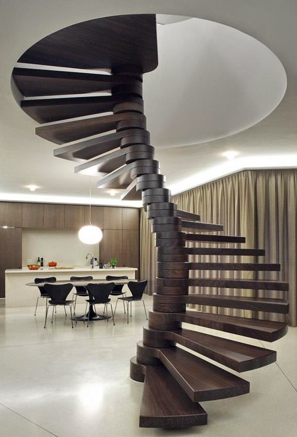 wooden spiral staircase design in minimalist kitchen and dining room interior