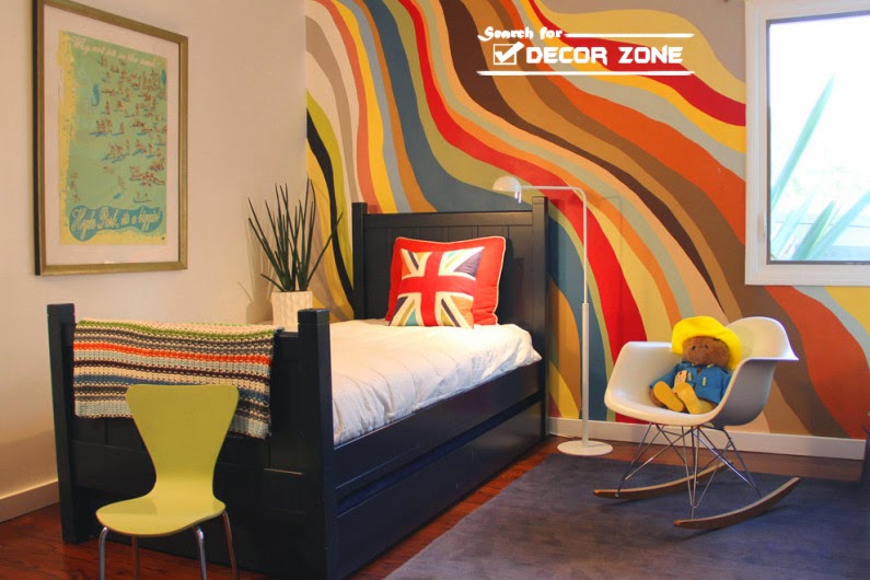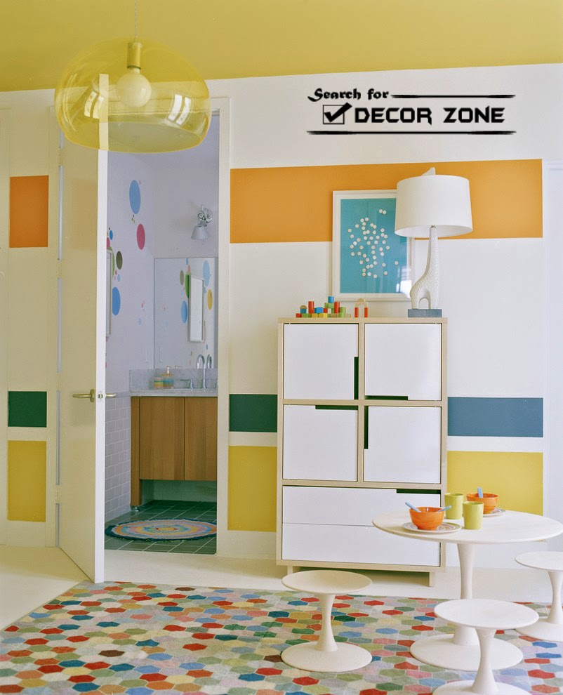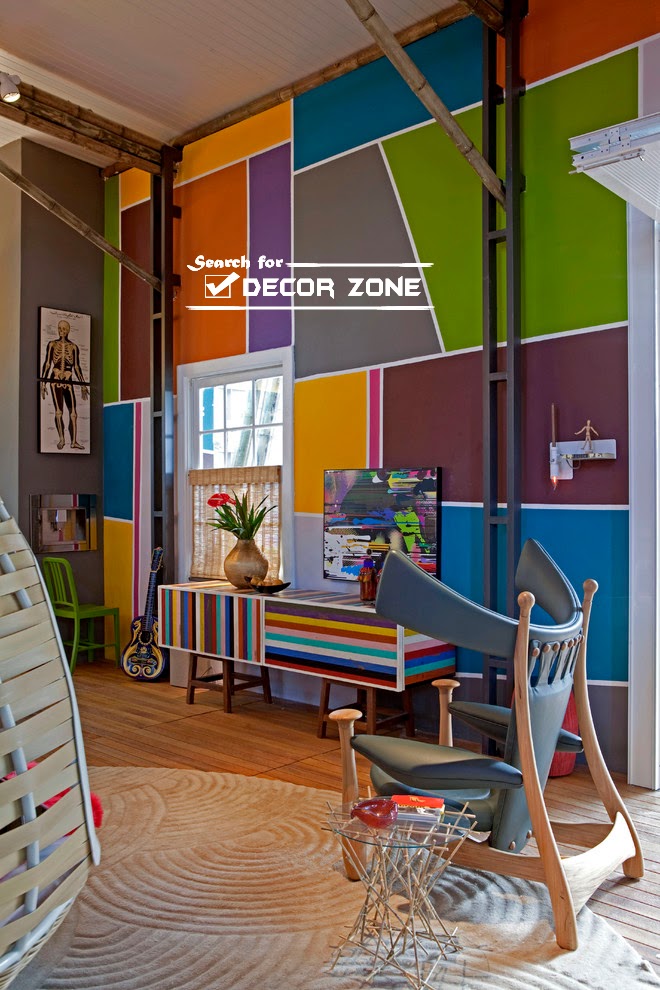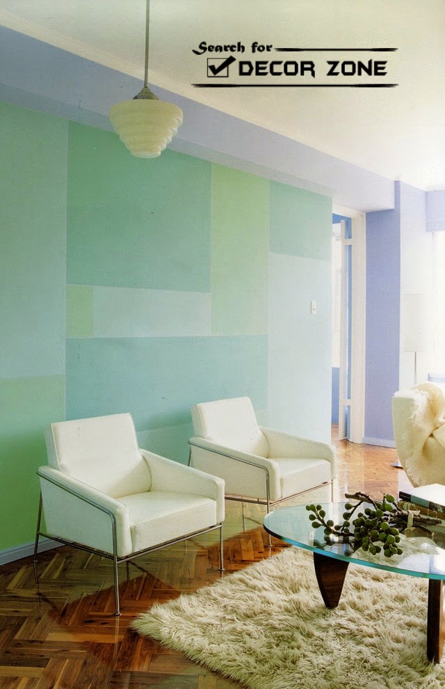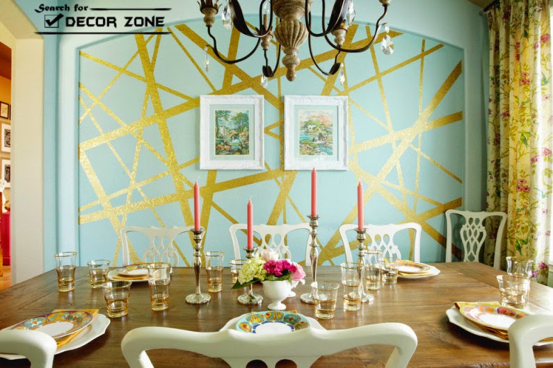 Saturation of colors, which you will use in these wall painting techniques and ideas, is crucial. So, bright colors combined with graphic forms on the surface of the walls is better to use caution, for example, highlighting with them one of the areas of the room (dining room, sitting room, a game in the nursery, a washroom in the bathroom).