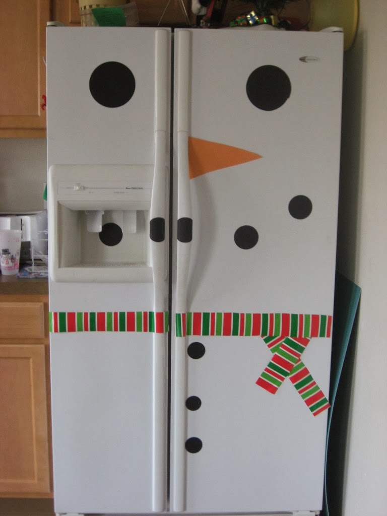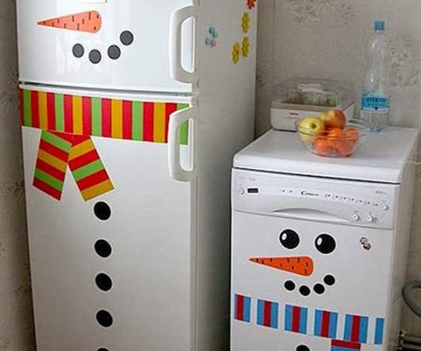 Cute and adorable decorating ideas for refrigerator. Paint it for the winter season with the help of colored adhesive tape or paper application! Instead bored and trite magnets, you can make this popular thing in any family, in a cheerful pakemona or hungry snowman, you