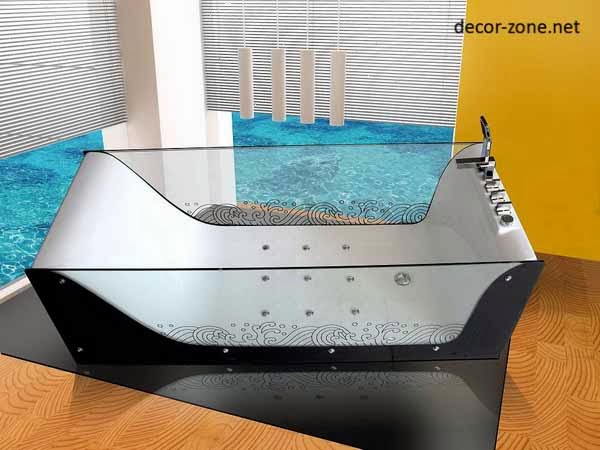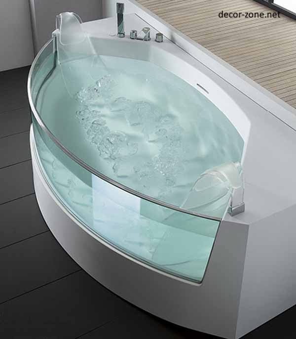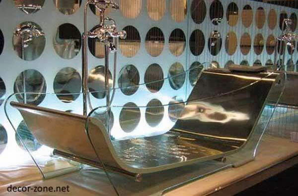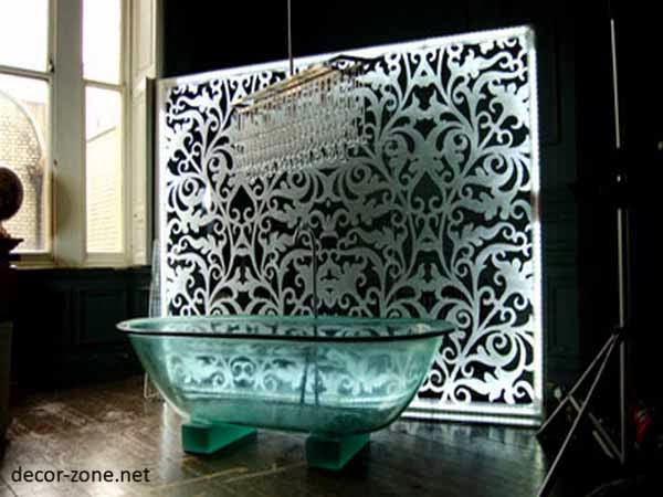 Many people are convinced that glass bath in bathroom designs is too brittle and fragile and hardly live for a long time. But modern technology has allowed to obtain a high-tech glass, which goes through a certain hardening, gaining strength and maintaining their transparency.