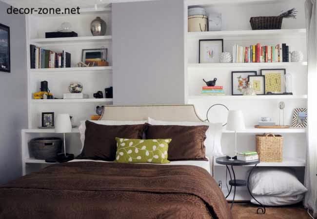 If you are sure that you need to put a lot of things around the bed, for bedroom shelving try to find furniture modules, which have a huge amount of shelf space. You can also order small lockers that will fit very well into the niche behind the headboard and will on the one hand, the suitable bedroom shelving ideas