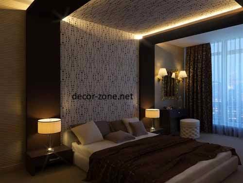 Also the division of the ceiling on alternating stripes of different colors or selection of functional areas is popular. For example, sleeping area can be distinguished niche in the headboard using vinyl wallpaper with a pattern and the same color “extend” the sleeping area on the ceiling. And the rest of the ceiling take another color.