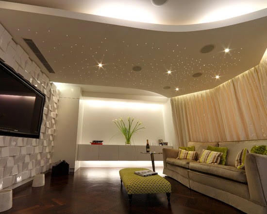 Familiar to us bulbs hardly suitable for making a false ceiling with lighting is really beautiful and exclusive. For this purpose, you can use other types of lighting. Rope This unusual name is a garland of traditional incandescent bulbs or LEDs. If you prefer incandescent lamps, you should know that the light from them will be uneven, and if at least one of the bulbs burns out, the entire remaining portion of the lamp will not light garlands, besides they are heated, which may adversely affect the shelf design. LEDs, though more expensive than incandescent bulbs, but their service life by several times more, and they consume less electricity. Spotlights They are used often for zoning premises or visual magnification of the room. In addition to the spotlights and be sure to hang a chandelier, because they are suitable for soft lighting, and not as the main approach. LED Ribbon Such tapes are not heated, so they are safe to be used for illumination plaster ceilings. In addition, the color performance of the tape is very diverse, and its installation the power of even unfamiliar with the electric man. However, this type of lighting can be used only as an ornamental because holistic room lighting, it will not. The life of the LED strip is very high – 50 000 hrs. Neon lights glow of neon lights gently and evenly, besides they can be used to create any curved design. Some prefer it to them, because they provide a variety of colors, but keep in mind that to install them on their own will not work – have to invite specialists. Fluorescent tubes and can be used for general lighting as well as for decorative lighting (service life of about 15,000 hours ). The only drawback: fluorescent lights can not be made ​​curved design.
