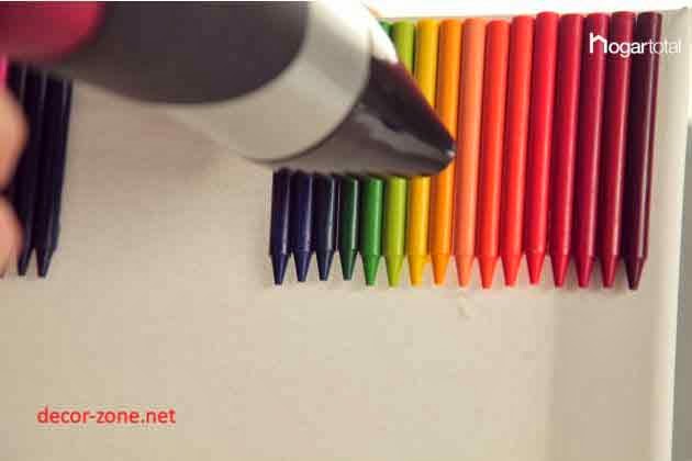 1. To begin with this painting, first of all we need to set the crayons to the canvas using the glue gun. To do this, you must first remove the paper with crayons that are coated, cutting along with a cutter to remove them more easily.