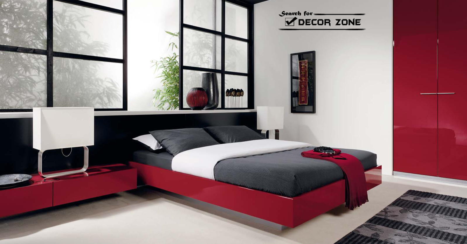 | red modern bedroom furniture ideas – platform bed and built-in wardrobe |
