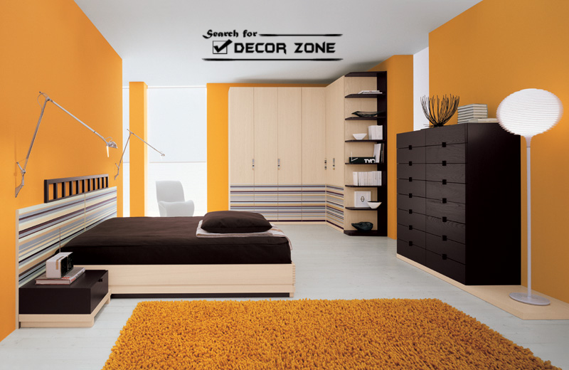 | orange bedroom with dark brown modern furniture |