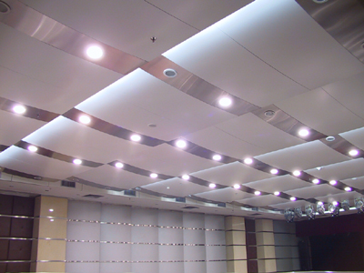 light spots between each tin tile an each other, that ceiling made from white tin ceiling tiles and silver breaks an light spots , that ceiling is suitable for theaters and lecture hall only