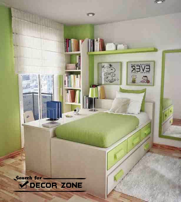To make the small bedroom interior more interesting, make bright accents – colorful blankets and pillows , bright carpet, curtains. using “white and bright” suitable for small bedrooms, where you can, for example, to paint the walls white and add some bright “spots” – yellow bedside mat, emerald or sapphire lamps, textile and pillows.