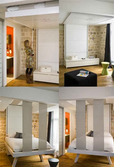 . Bed in the ceiling . Ideal for very small apartments, this bed design descends from the ceiling, elevator, when you click on the remote. Also it is hiding. The main thing – do not click randomly on the bullets at night π