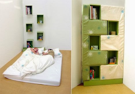 . Bed-closet . This bed is like Tetris fans π When folded it serves as a closet .when unfolded – serves as a bed + a few shelves on the wall. In the closet little space in the mattress is “holes”, but in fact what an idea!