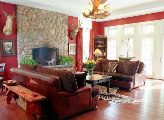 In this case, in the living room should be a massive brutal furniture with brass or bronze parts. On the wooden floor you can lay animal skin, and on the couch casually throw quilt in Indian style. Tablecloth in the same style should be on the table. Ceiling and walls execute in a single tone, hang lights in the shape of horns, Native American masks, macrame or a cowboy hat. On the shelves are welcome clay figurines and leather. The color palette should include color savanna, dirty faded blue hue, as well as shades of brown and ocher.