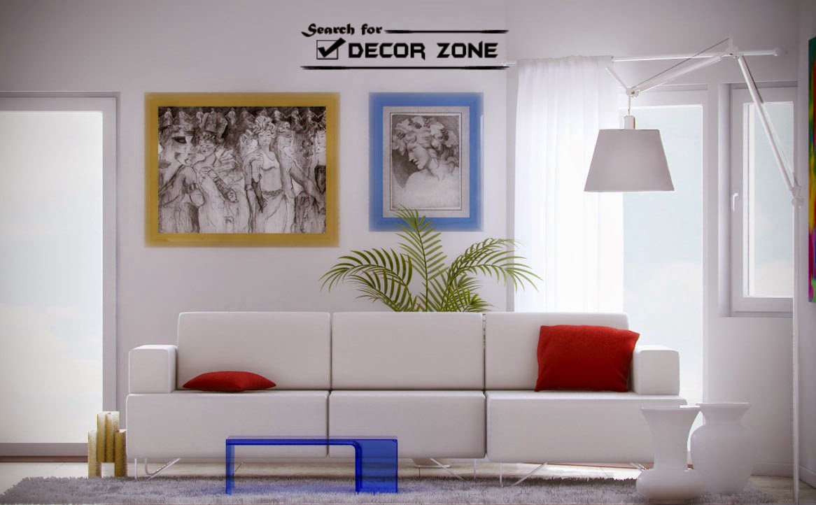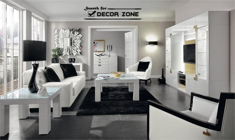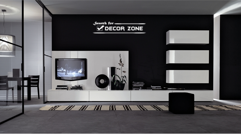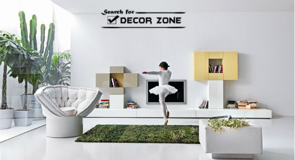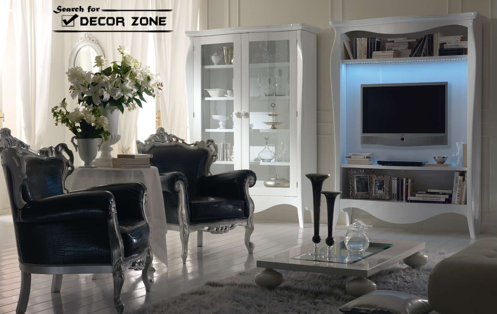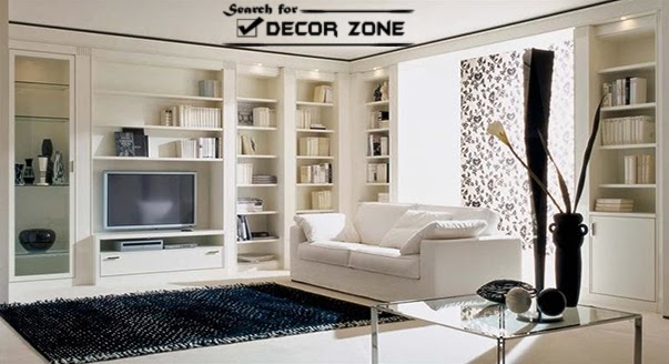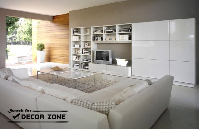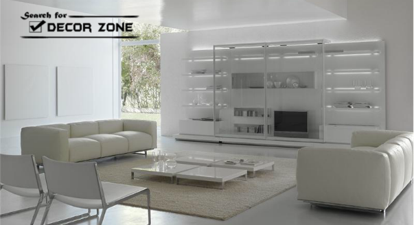 Consider the characteristics of white living rooms. White color in the interior can be present with varying intensity – solo or combined with other colors. In any case, the white interior just need to give volume. To do this, the color of furniture for the living room can be set off. For example, white sofas and dressers with glossy surfaces look better on the background of the walls beige or gray. A snow-white TV unit can be equipped with a black frame to get an interesting contrast. This living room furniture, as glass coffee tables or white shelving showcases supplemented illuminated and decorated with tinted satin silver or glass, make the interior sparkles like a diamond.