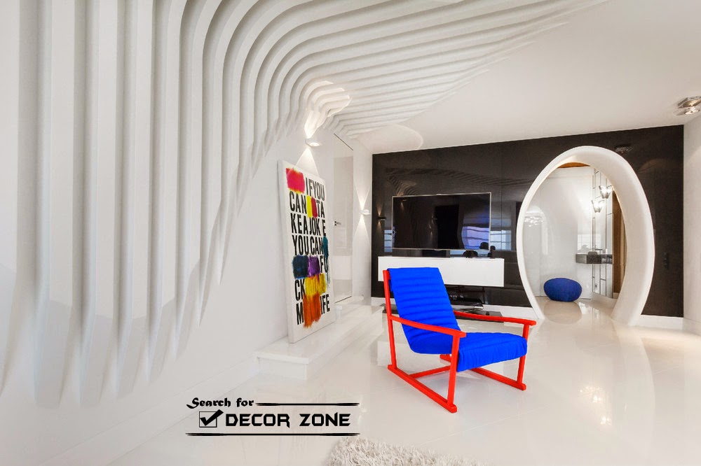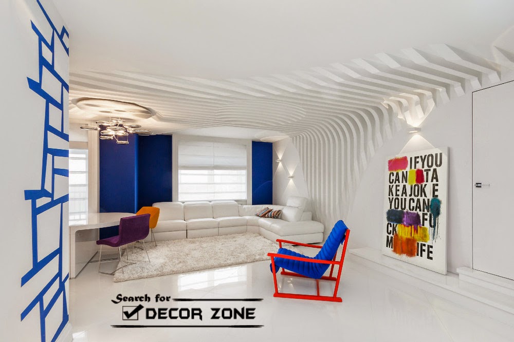 Textured background. Designer opted snow-white as the living foreground color. Ceiling, floor, walls and most of the furniture is white. white ribbed background, rolling from the ceiling on the wall. This is made of plasterboard. Another textural element – carpet with long pile.