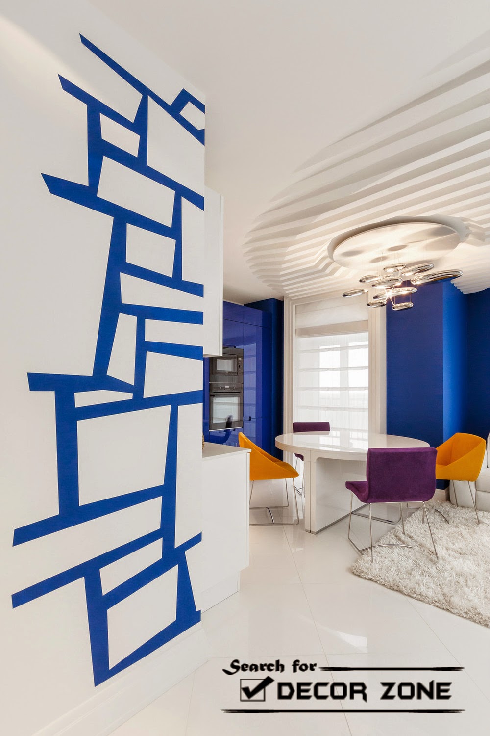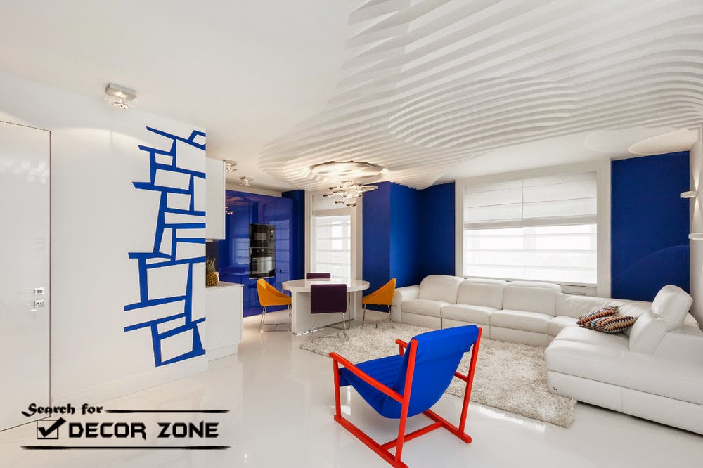 Geometry color . The interior living room with kitchen, designer joined the large surface, painted in contrasting white and blue colors. And as the transition, combining these elements made plane geometric pattern covering the wall at the junction of the two zones.